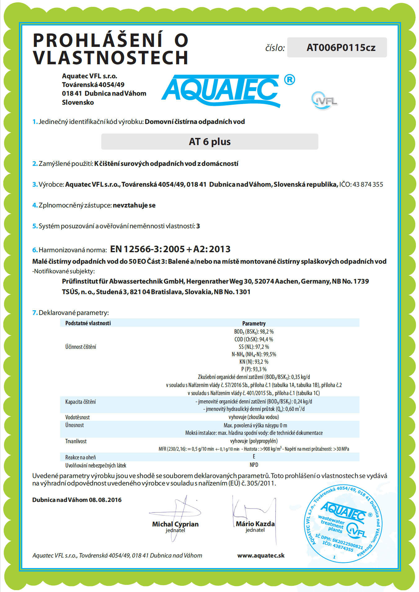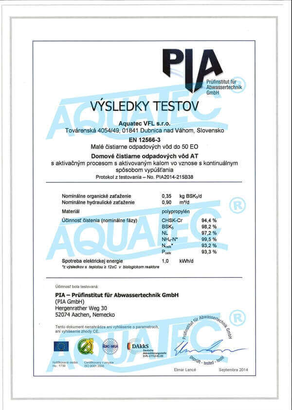 Splňuje kategorii výrobku označovaného CE (včetně kategorie PZV) – nevyžaduje přídavné zařízení pro srážení fosforu.
